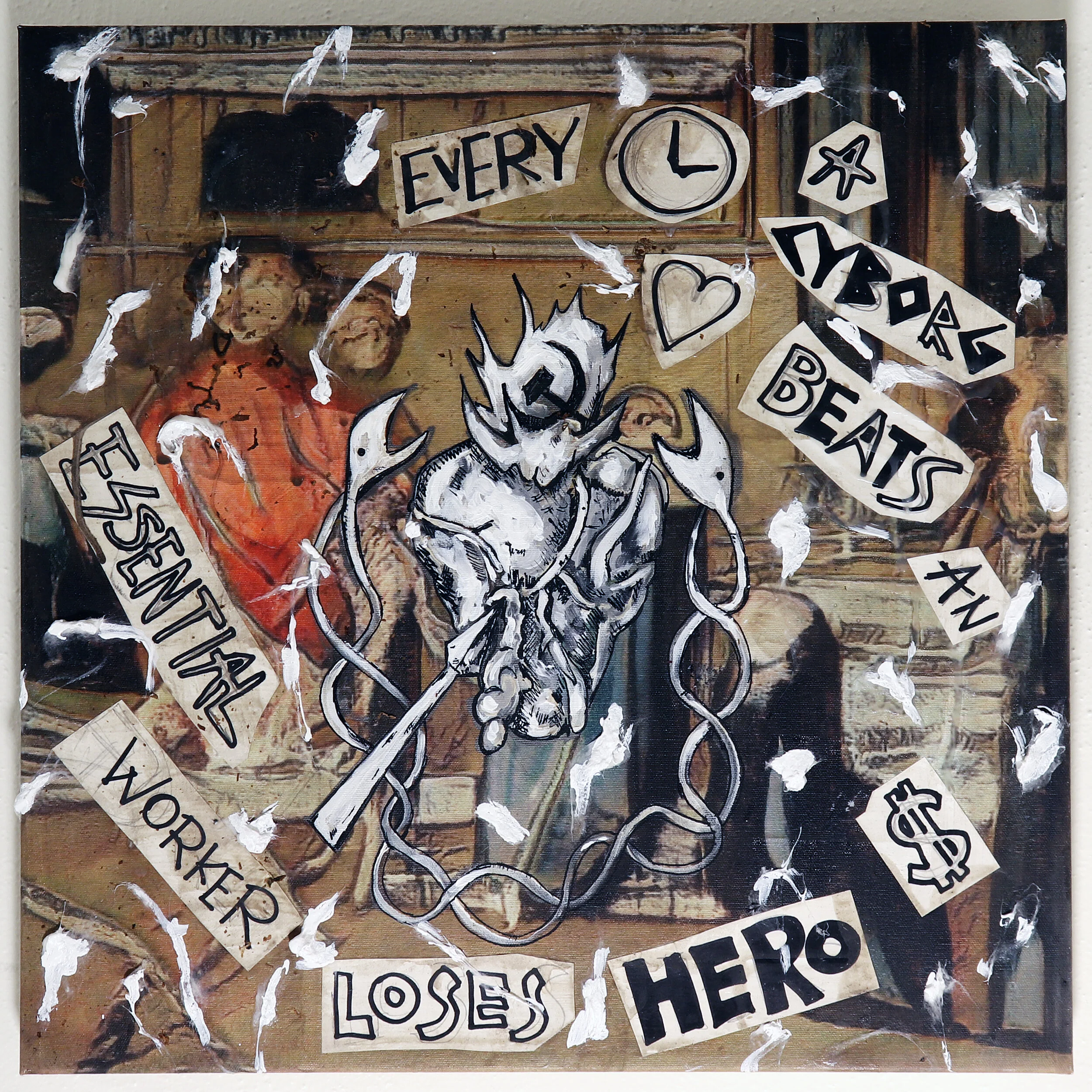 Acrylic, ink, coffee, tobacco, cotton and ash on “AI Generated Painting” (retailed at $44 online). This painting is not anti-cyborg. A lot of essential workers who lost hero pay are cyborgs. They imprison us all with the work of our beating hearts.